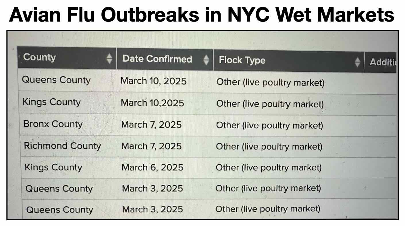 Avian flu outbreaks that have occurred since NYC’s live animal markets reopened following a five day closure in February.