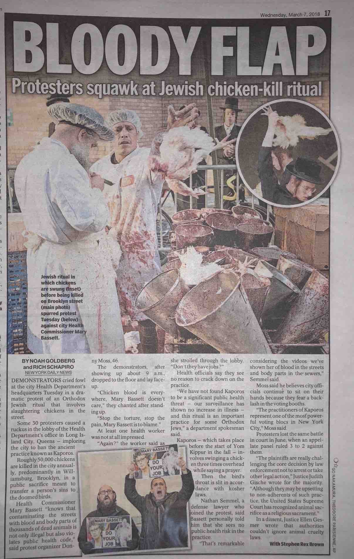 “Dr. Bassett turns a blind eye to the egregious health code violations because the practitioners of the ritual represent a powerful voting bloc that helped elect her boss, Mayor Bill de Blasio,” said Jessica Hollander, a NYC activist who participated in the protest. “We can’t stand by silently while politics needlessly compromises public health and subjects tens of thousands of animals to starvation, thirst, physical violence and death.” The chickens are held in small crates with no food or water for several days before they are swung in the air and slaughtered on the street as part of the Kaporos ritual.