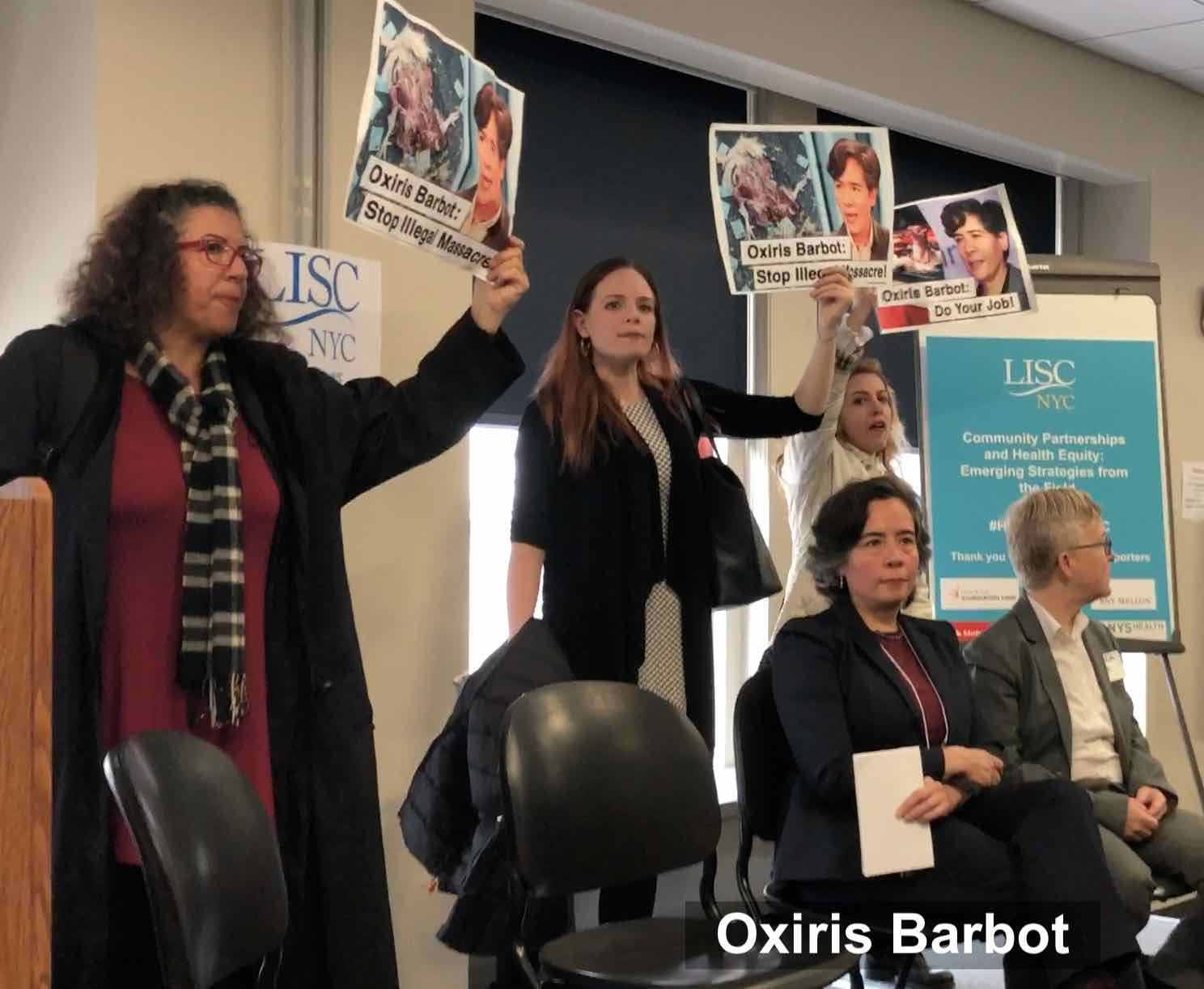 Unsatisfied with Dr. Bassett’s refusal to enforce the health codes, activists have begun targeting her deputy commissioners, arguing that their silence makes them complicit in the illegal mass slaughter. In March and April, they disrupted the public speaking engagements of Assistant Commissioner Oni Blackstock and First Deputy Commissioner Oxiris Barbot.
