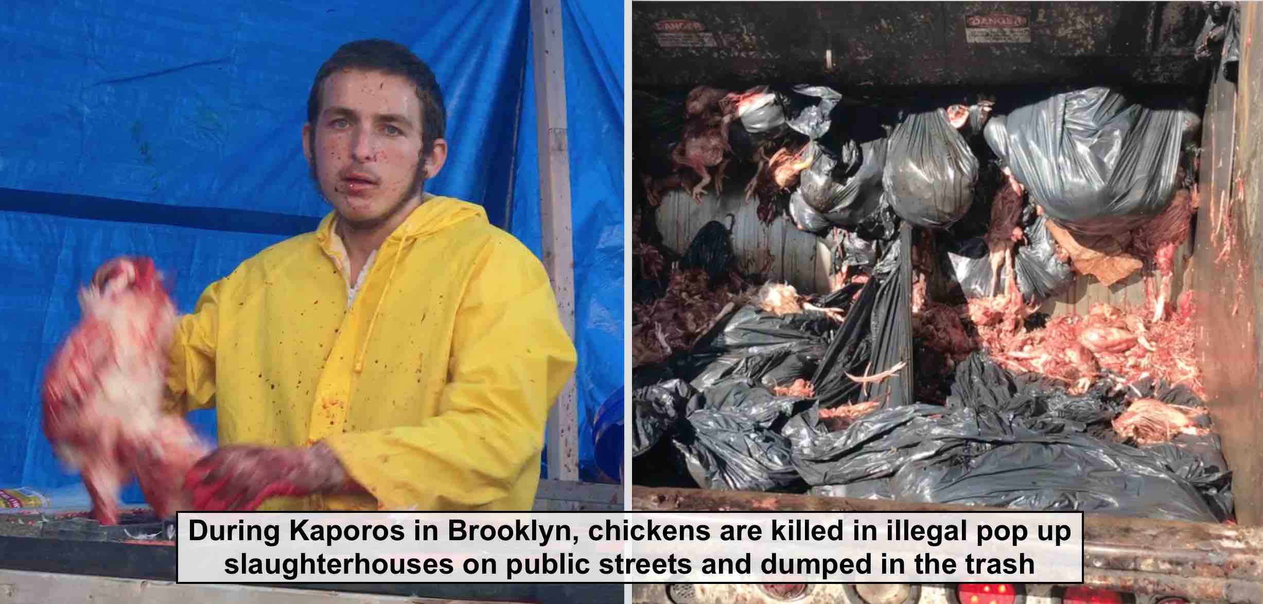 Kaporos is a annual ritual in which ultra-Orthodox Jews swing chickens around their heads on public streets while saying a prayer to transfer their sins to the animals. After the ritual, they give the chickens to a man on the street who slices their throats in an open air tent erected in several neighborhoods in NYC. The ritual is performed prior to Yom Kippur, the Jewish Day of Atonement. In Brooklyn, which is home to hundreds of thousands of ultra-Orthodox Jews, an estimated 60,000 chickens are swung and massacred each year.