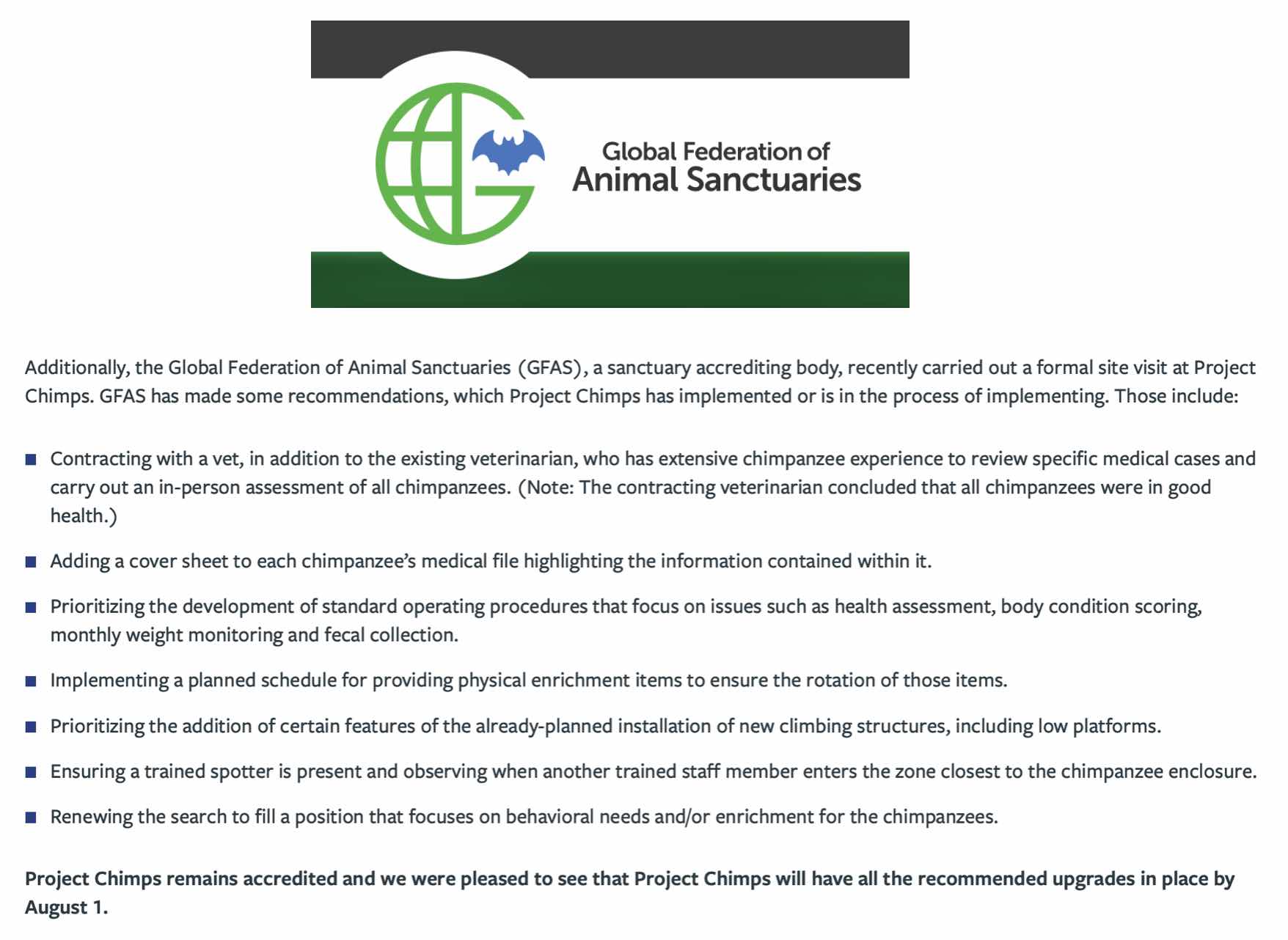 The Global Federation of Animal Sanctuaries (GFAS) made some of the same recommendations as the whistleblowers to improve the welfare of the chimps